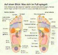 Zahlreiche Regionen des Fußes stehen in einer besonderen Art von reflektorischer Beziehung zu bestimmten Körperteilen und Organen. Dies lässt sich in hilfsdiagnostischer wie in therapeutischer Hinsicht feststellen und nutzen. Aus Gründen der übersichtlichen Darstellung werden die Füße in fünf vertikale und drei horizontale Zonen eingeteilt. Dadurch ergibt sich am Bild des Körpers ein anatomisch-topographischer Rahmen, in dem sich die Organe wie ein Mosaik einfügen.